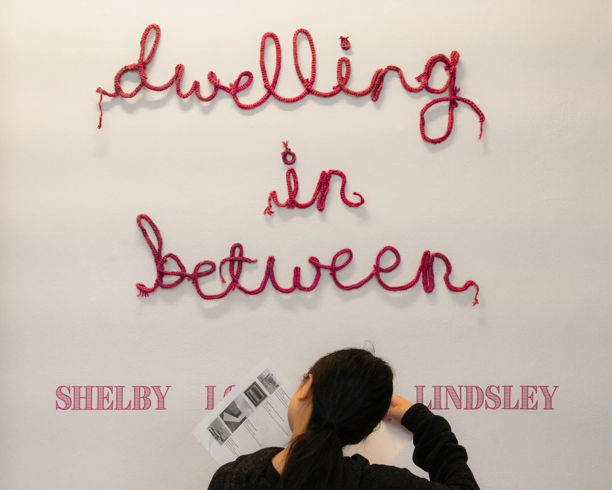 Browsing the exhibition program at Dwelling In Between, Shelby Lorraine Lindsley’s MFA thesis exhibition at Otis College of Art and Design in Westchester, California.
